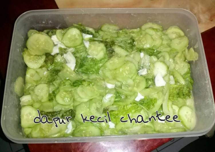 - Cuci bersih selada dan potong-potong. Kupas mentimun dan iris tipis-tipis.