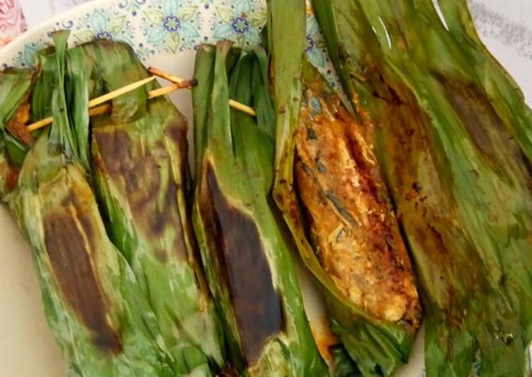 - Siapkan daun pisang, potong petak ukuran sedang sekitar 4-5 lembar. Masukkan ikan 1 sendok makan. Kalau mau lebih banyak boleh, sesuai selera yaa.. Bungkus daun pisang dan kunci dengan tusuk gigi diujung kiri kanan