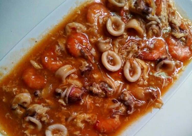 - Tambahkan air, masukkan saos sambal, saos tomat, kecap asin, kecap manis, saos tiram,cumi dan udang. lalu beri garam,gula dan lada. TES RASA