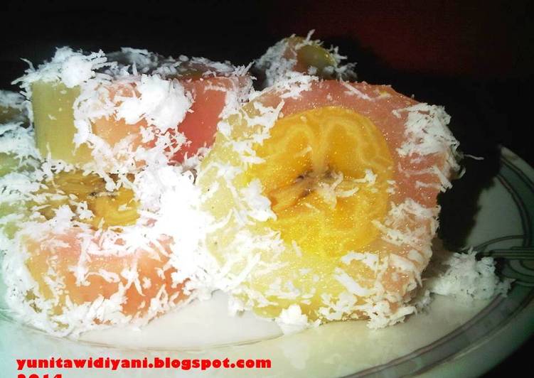 - Campur singkong parut dengan kelapa parut, bubuk agar2, gula pasir, garam dan vanili, aduk rata. bagi adonan menjadi 2 bagian, beri pewarna makanan pada satu bagian adonan dan biarkan putih pada bagian adonan lainnya.