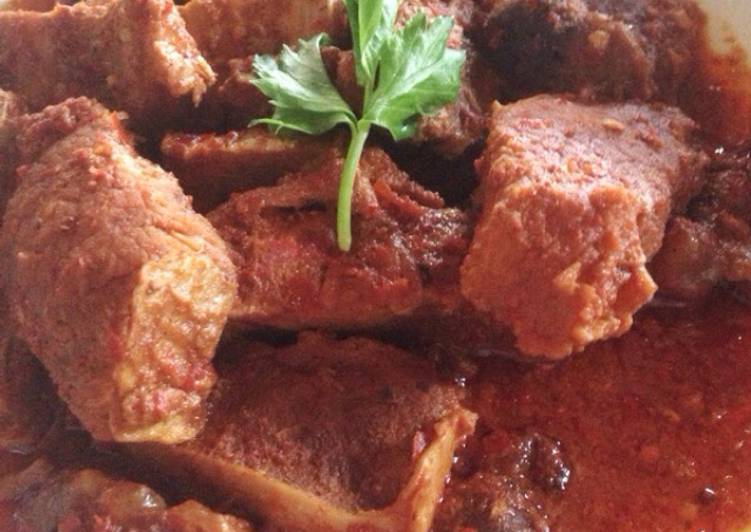 - Blender cabai kriting, bawang, kayu manis dan jahe. Lalu tumis dengan minyak.. Lalu masukan blenderan lagi cabai merah besar juga kedalam tumisan serta air asam jawa. Aduk lalu masukan daging, hingga harum aduk terus sampai matang kurang lebih 15-20 menit api sedang.