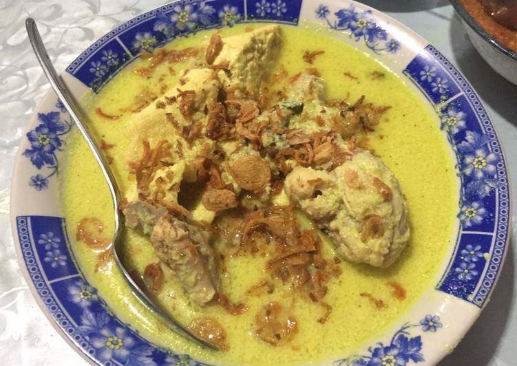 - Setelah mendidih, tambahkan santan kental dan kelapa goreng. Kecilkan api, aduk terus agar santan tidak pecah. Setelah ayamnya mateng, angkat dan sajikan.