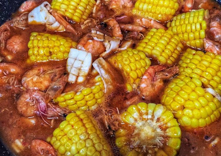 - Cuci bersih cumi2 dan udang buang kulit cumi Dan kerat2 lalu potong sedikit mulut dan hilangkan sungut udang lalu peraskan semua jeruk lemon dan masukan parutan jahe sisihkan, kemudian bersihkan jagung manis lalu rebus dan sisihkan, siapkan bumbu rempah dan saus2an.